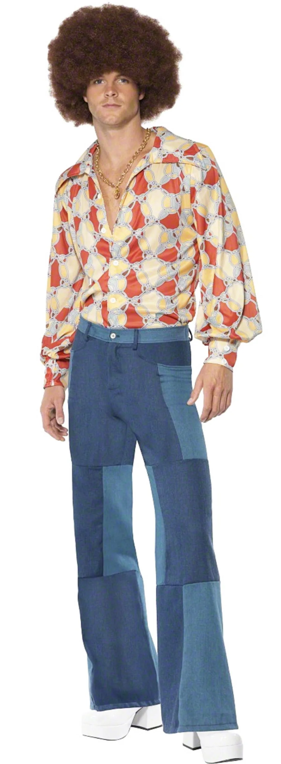 Mens Outfit. Included is a loud printed shirt and blue flared trousers.