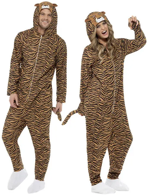 This stylish tiger printed zip up jumpsuit with a hood that includes
