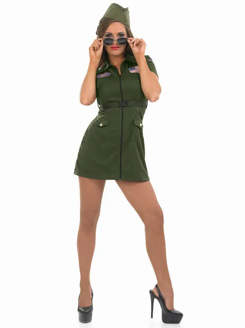 Included in this Top Gun themed outfit is a short dark khaki green dress