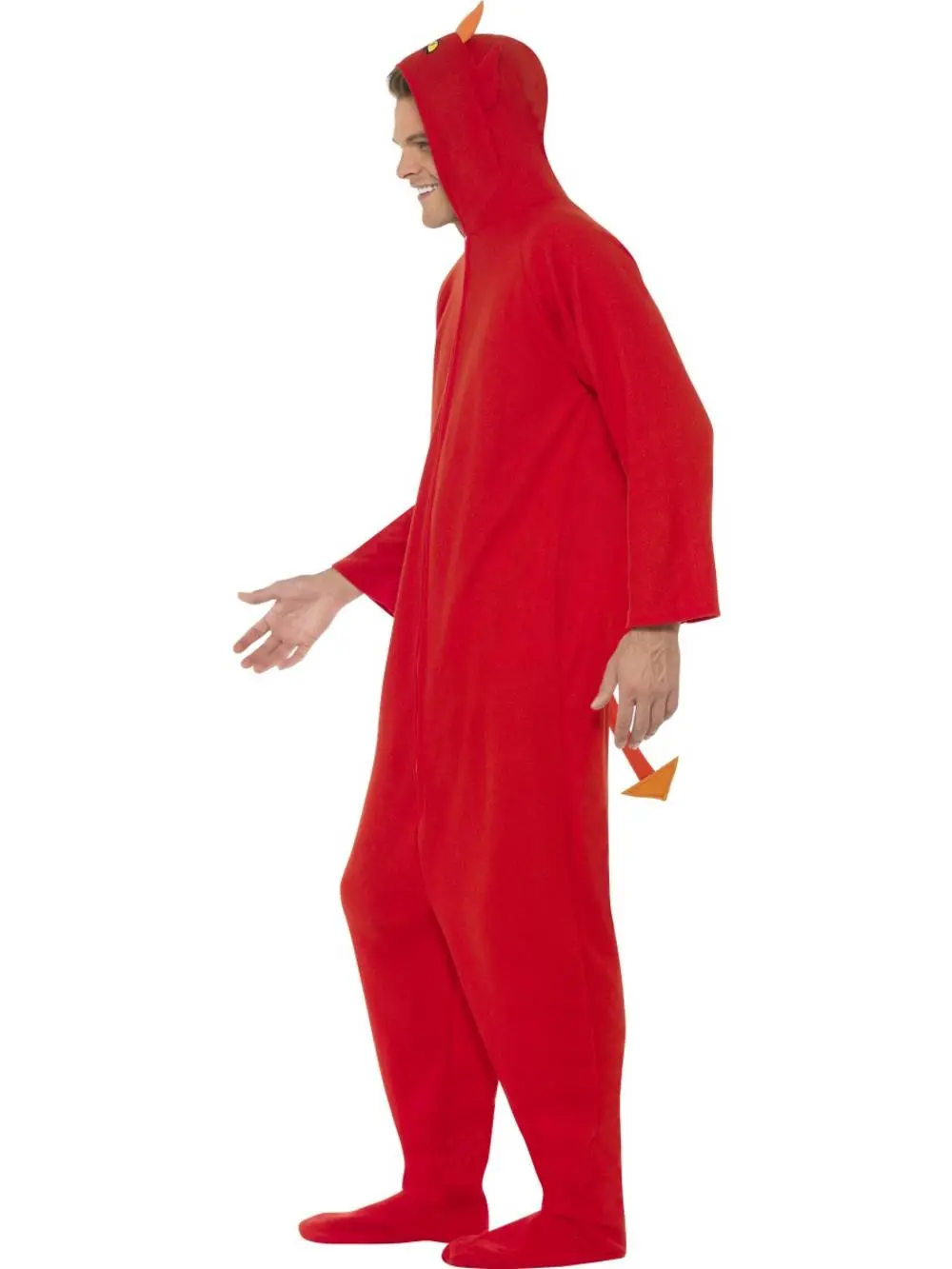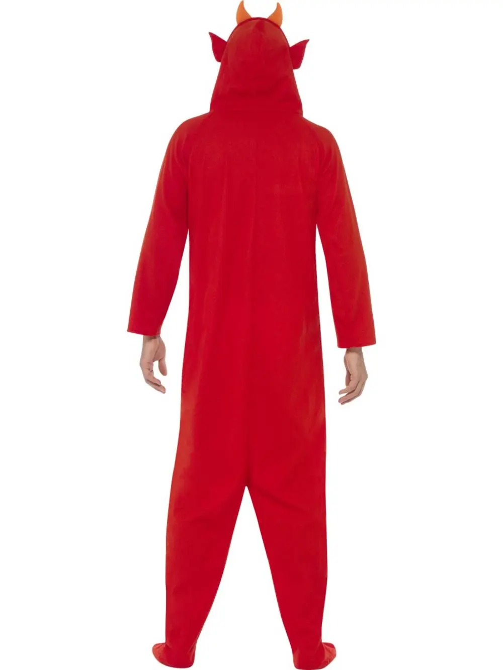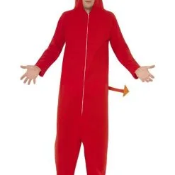 red jumpsuit styled with an attached hood, horns, foot covers and a