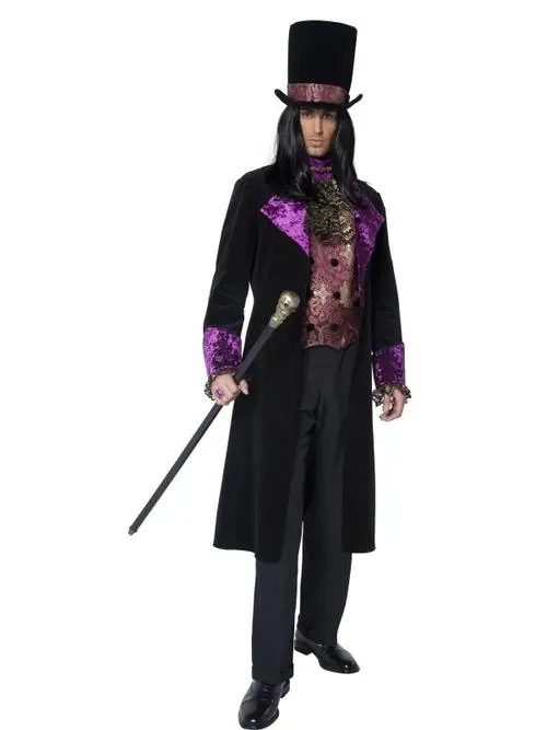 The stylish vampire costume comprises of a long black jacket with purple