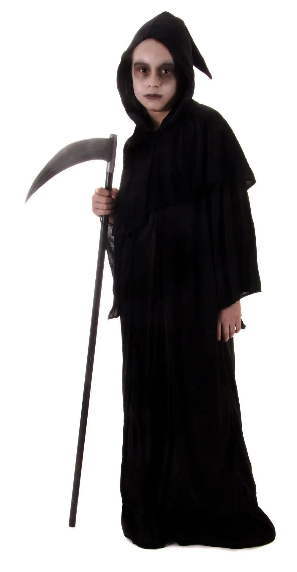 creepy looking Kids Grim Reaper Fancy Dress Costume.