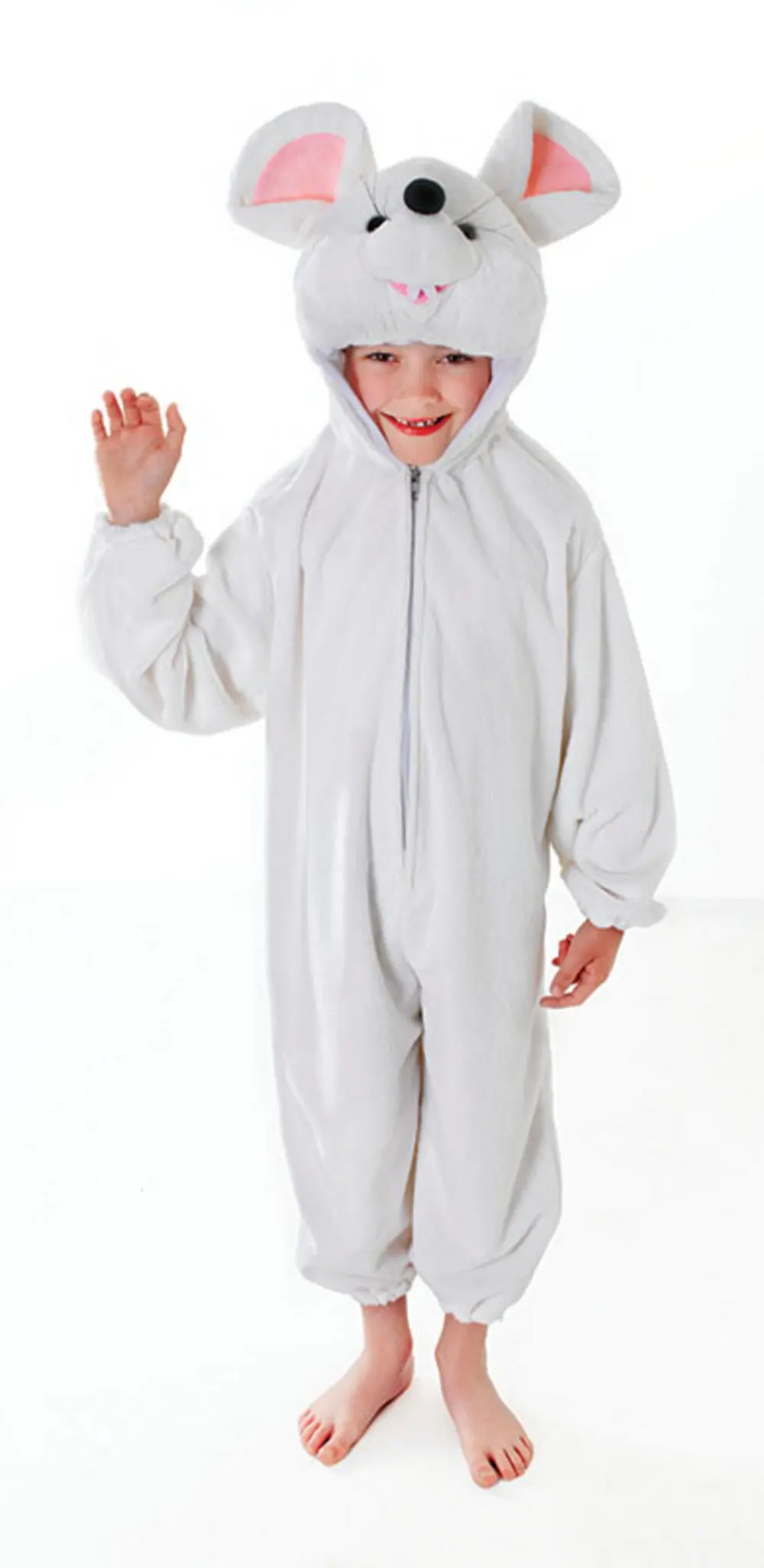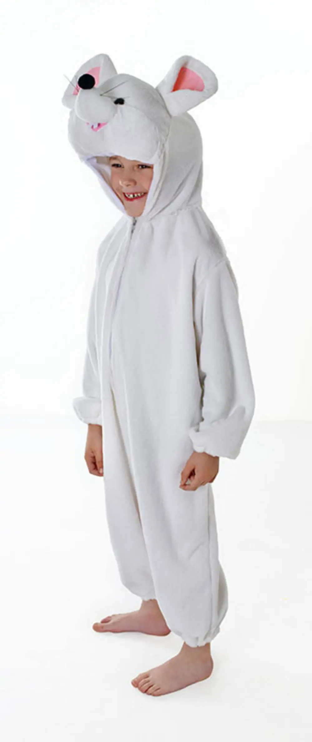 Includes furry all in one white mouse bodysuit and hood with plush mouse