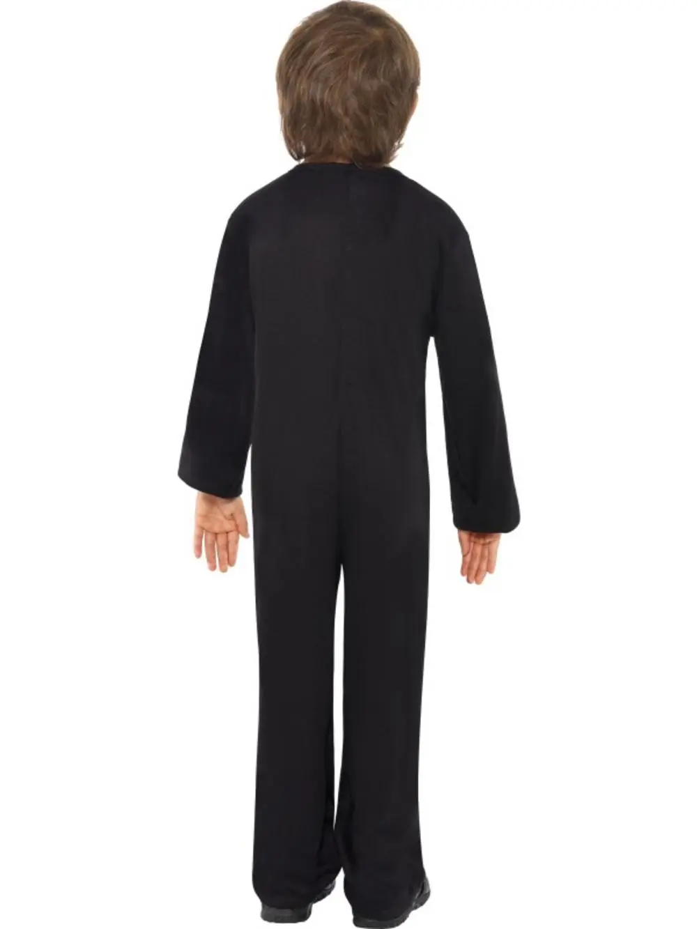 Included is a fantastic long sleeved black jumpsuit decorated in bright