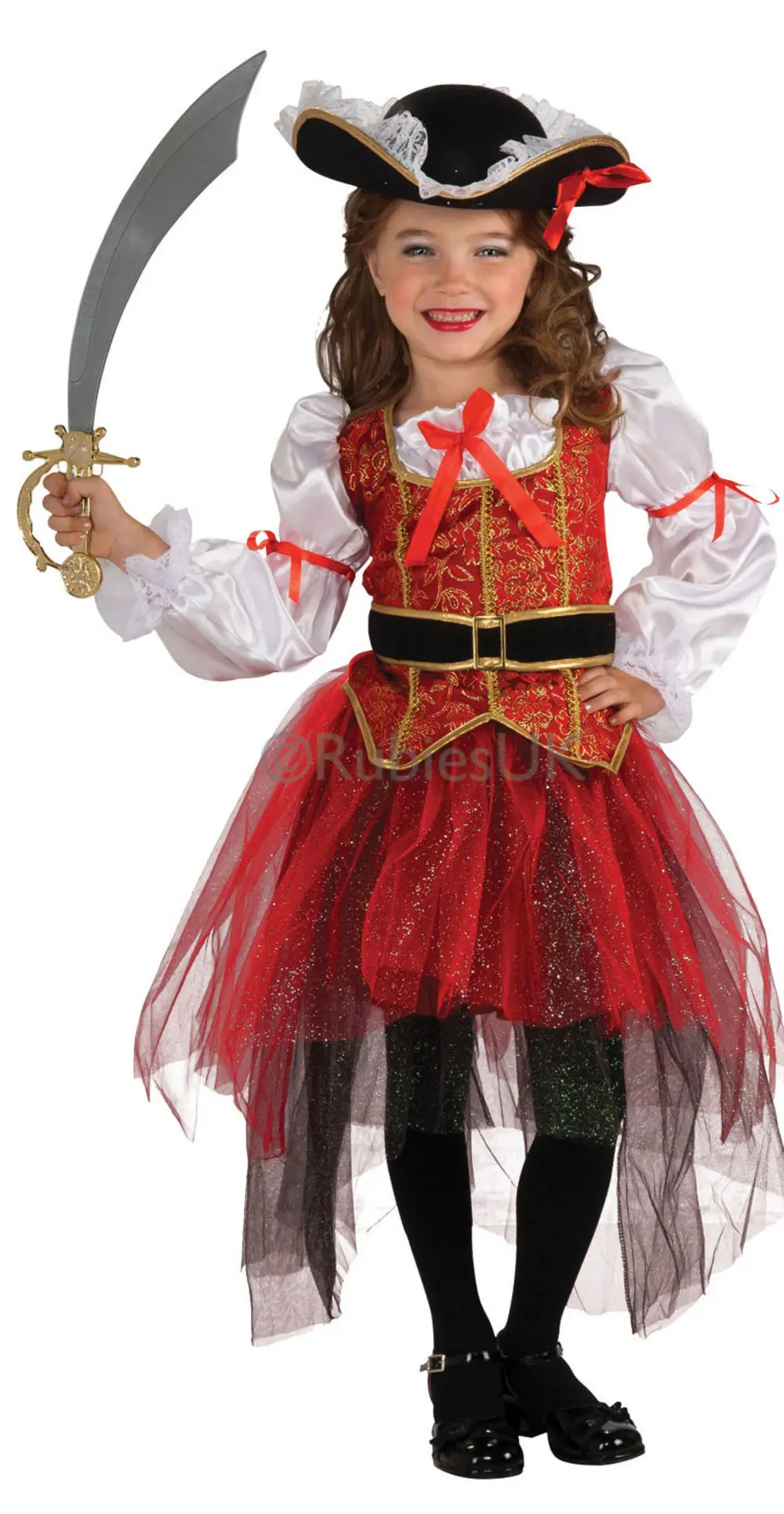 pirate style blouse, red vest with a gold trim, black and gold belt, and