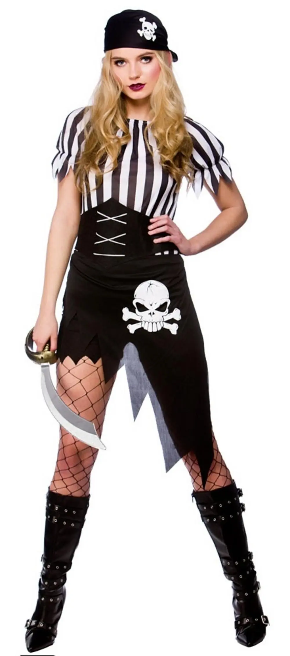 overskirt. Completing the look is a black bandana with matching skull