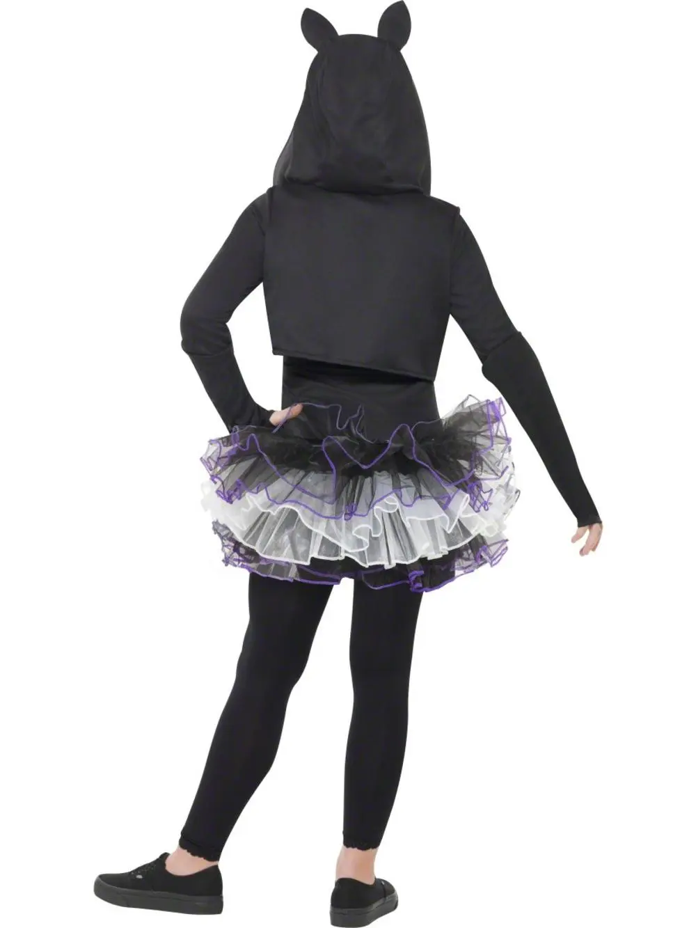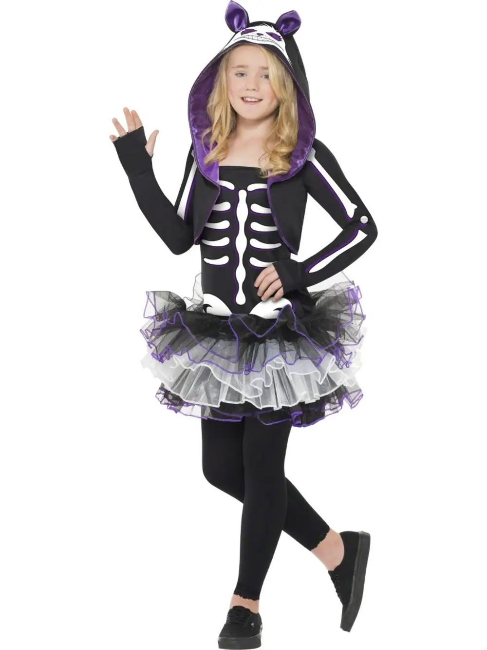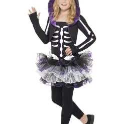 Completing this girls’ Skeleton fancy dress is a black shrug decorated