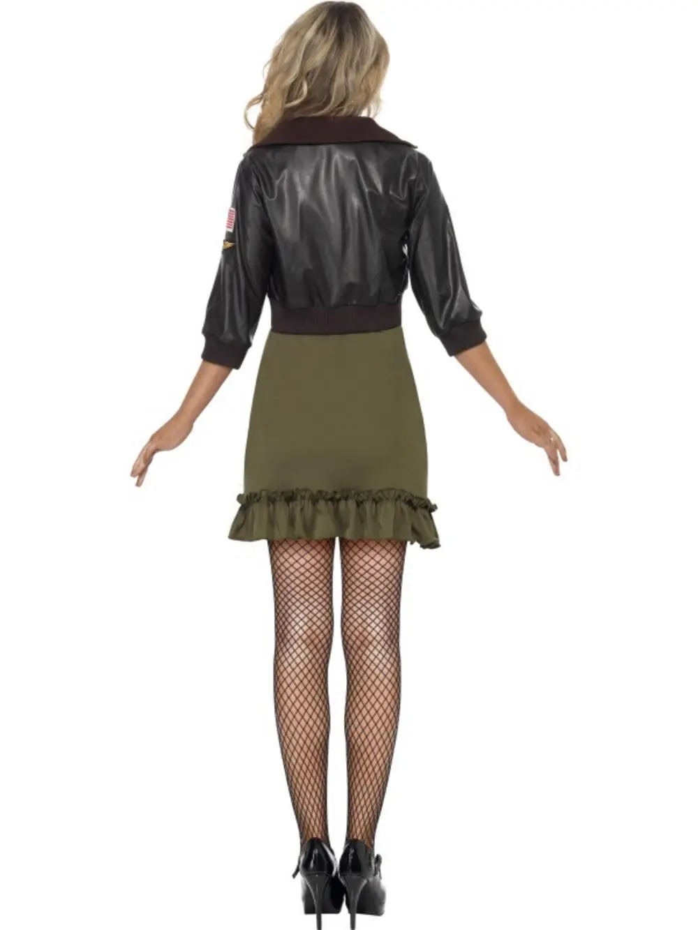 Gun fancy dress costume is a leather look bomber jacket styled with