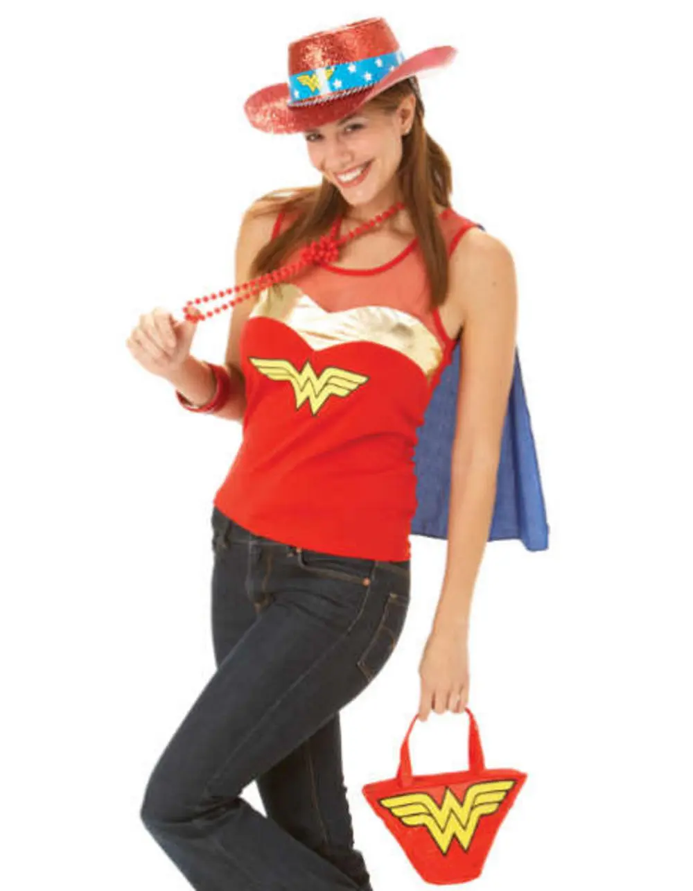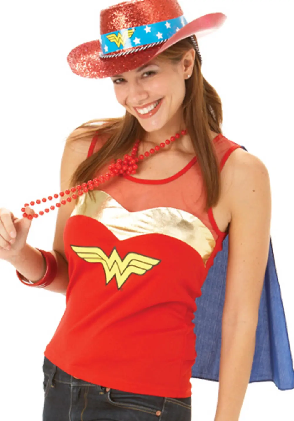 Red top with yellow Wonderwoman “W” logo and attached red cape