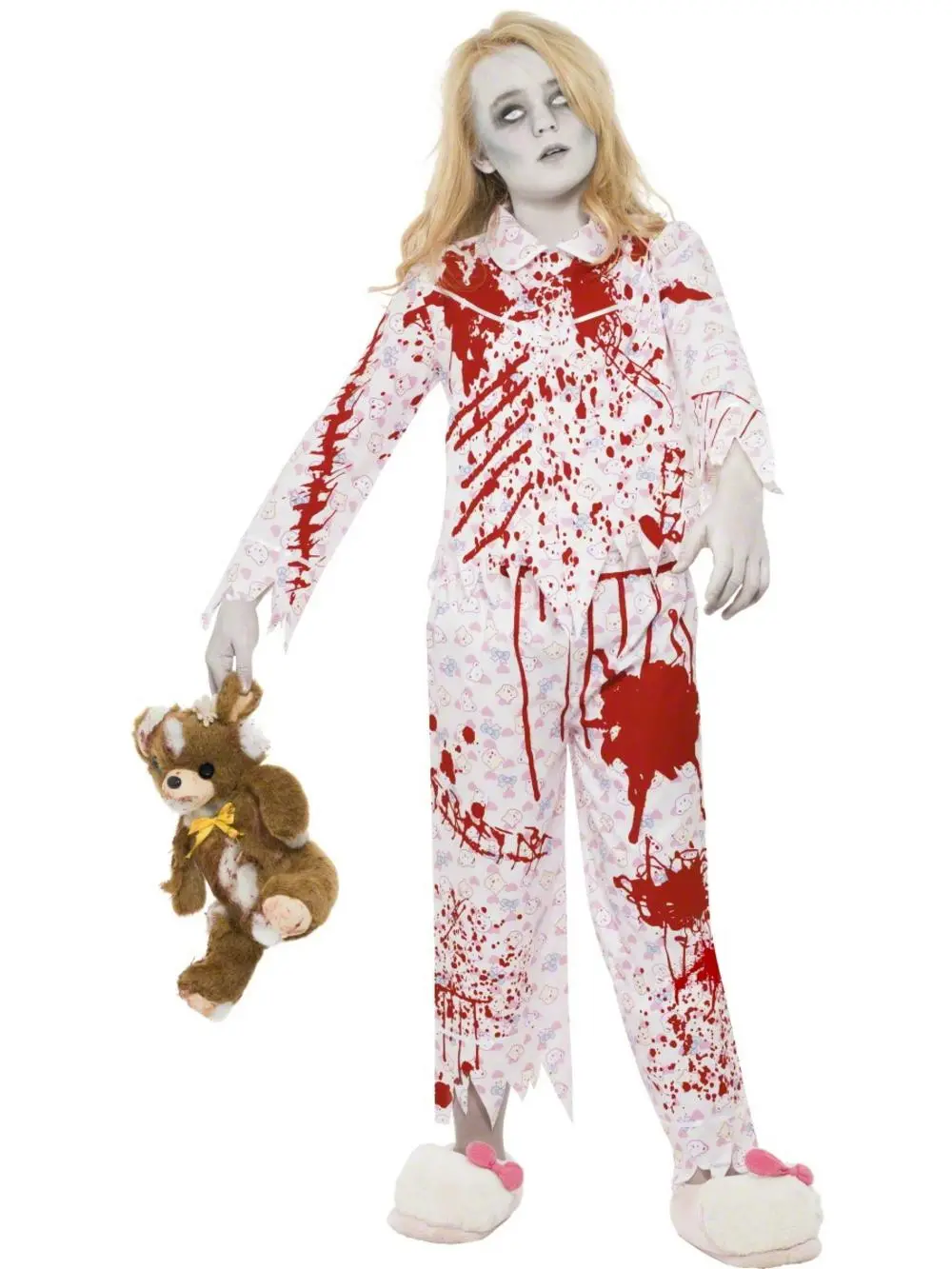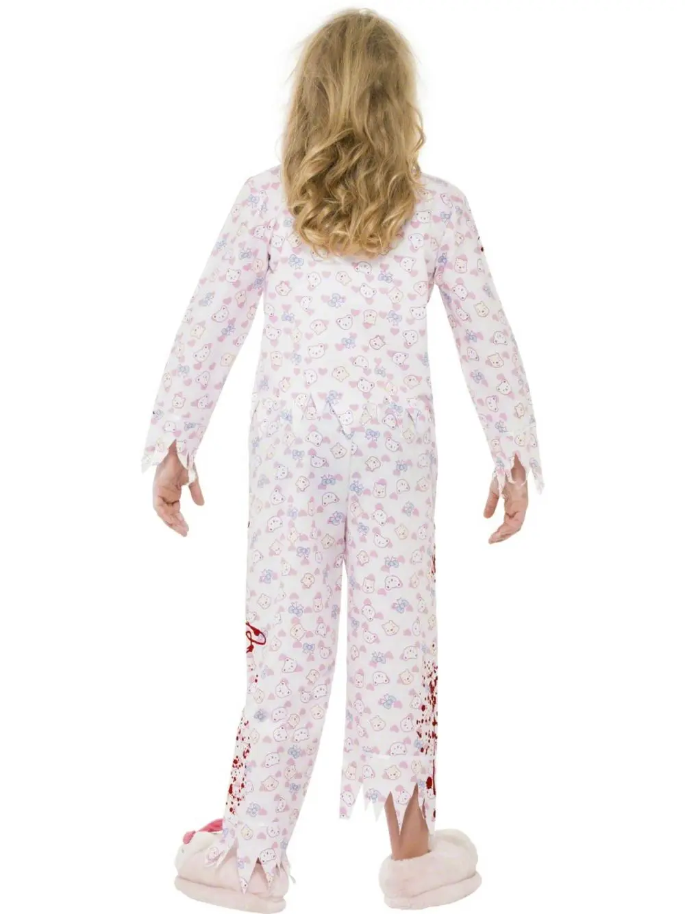 This girl’s zombie costume includes a pale pink pyjama style top with